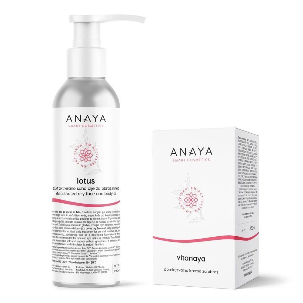 ANAYA VITANAYA Rejuvenating Face Cream and ANAYA LOTUS dry oil are exceptionally effective in renewing and replenishing the skin daily while maintaining a fresh and youthful appearance. The combination is suitable for all ages and skin types. Accelerated regeneration of the top skin layer is enabled by effective microorganism EM® activated precious ingredients. This way the skin absorbs everything it needs for a fresh and healthy glow, as well as the feeling of comfort and satisfaction.